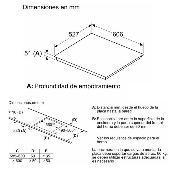 Kích thước bếp (chiều cao, chiều dài, chiều rộng) :  51 x 606 x 527 mm