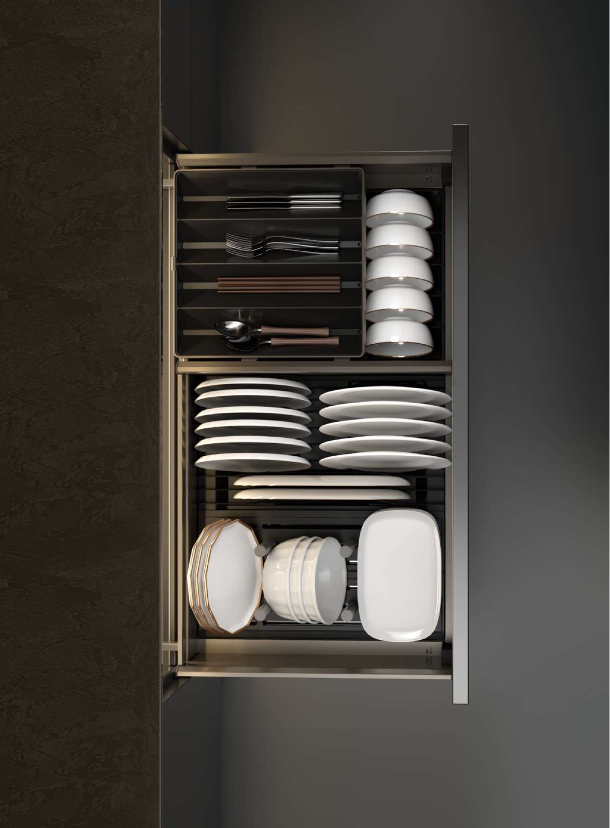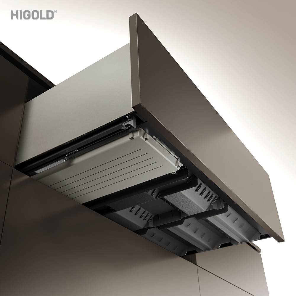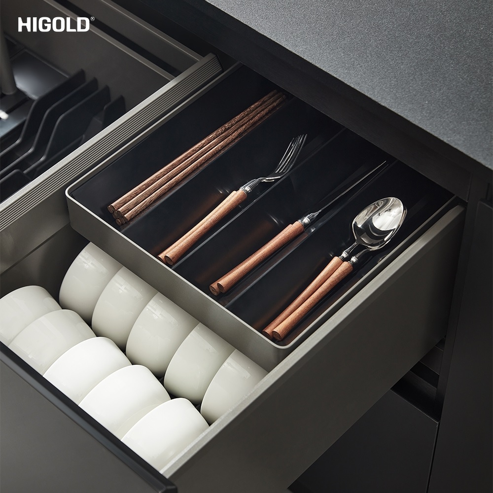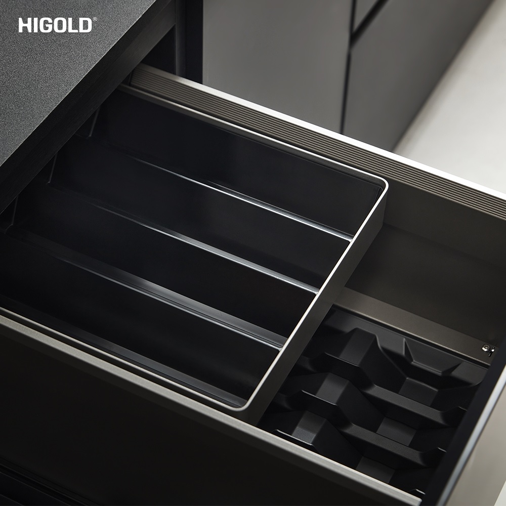 Tích hợp thêm ngăn kéo con tại vùng lửng dùng để đựng dụng cụ ăn, thiết kế khay lượn sóng chữ V chống va đập, giúp tận dụng hiệu quả khoảng trống thường bị lãng phí trong hệ tủ.