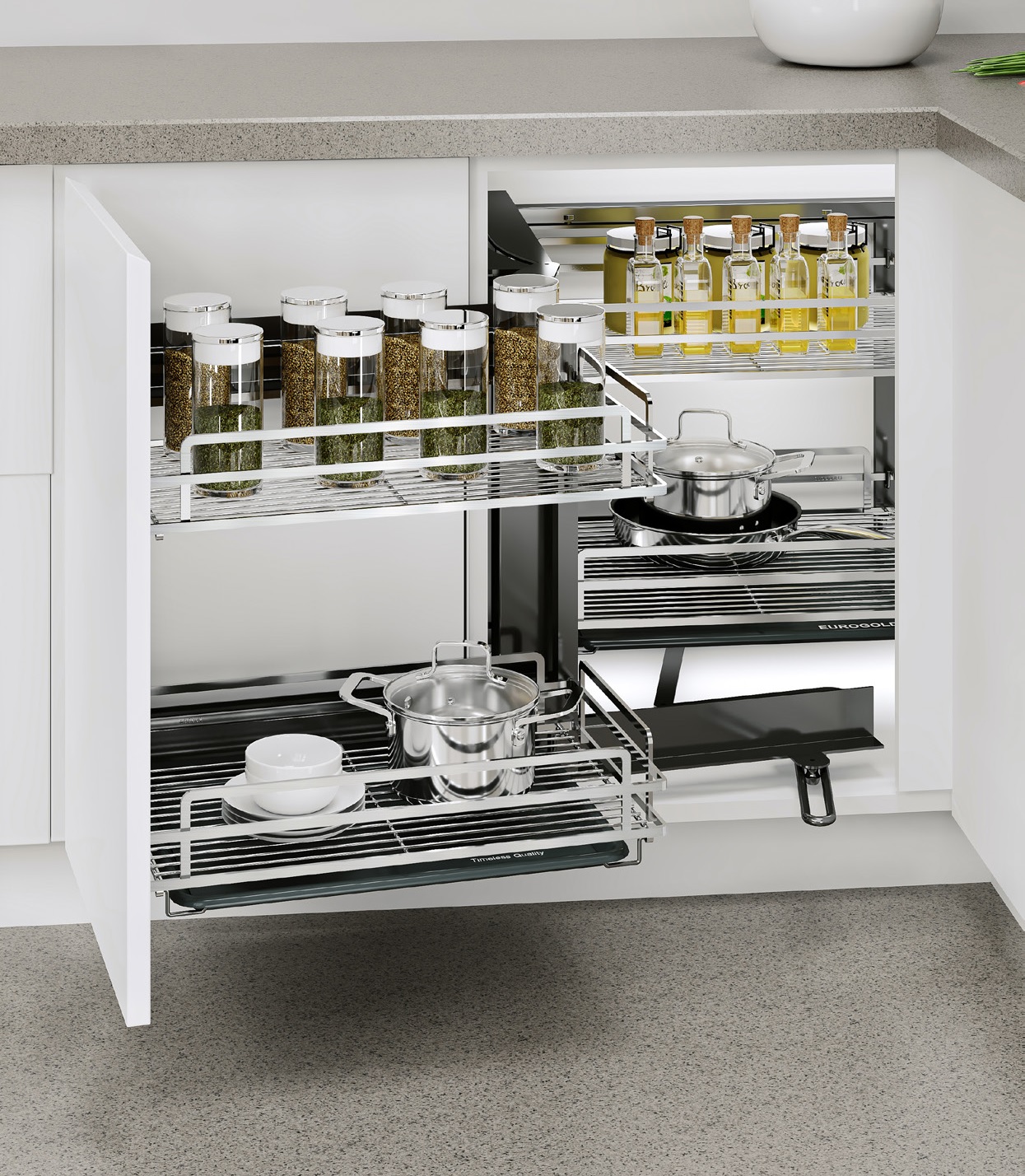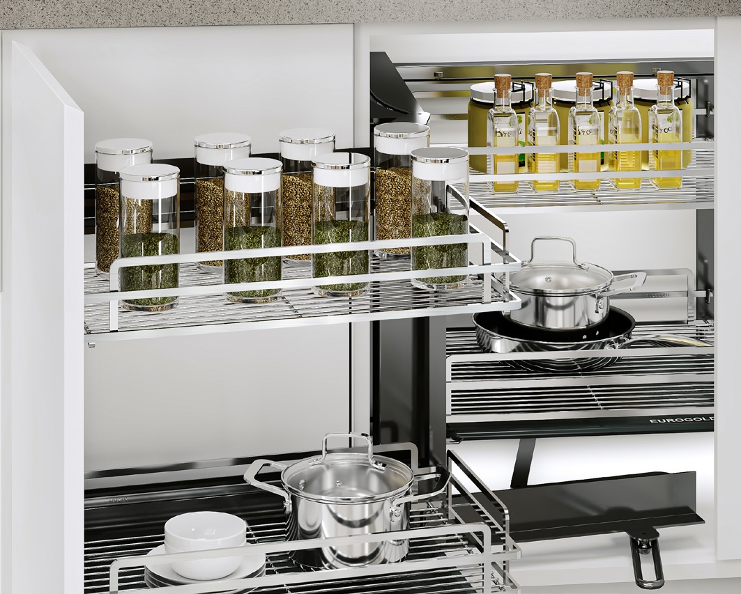 Với những phụ kiện thông minh như giá liên hoàn nan ray giảm chấn Eurogold, mọi góc chết trong tủ bếp đều có cách giải quyết. Góc chết tủ bây giờ không những là nơi bảo quản được hàng loạt các loại đồ đạc vật dụng nhà bếp một cách hữu dụng mà hơn nữa, còn là điểm nhấn giúp căn bếp thêm hiện đại, tiện nghi.