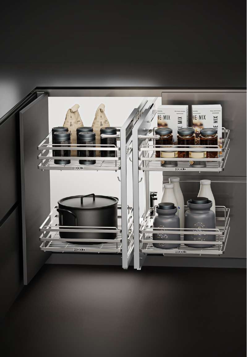 Kệ góc mở toàn phần Diamond 2.0 giúp biến góc tủ bị lãng quên thành nơi lưu trữ lý tưởng. Với kiểu dáng sang trọng, các khay chứa có thể điều chỉnh linh hoạt vị trí lắp đặt để phù hợp với chiều cao của bất kỳ các vật dụng nhà bếp nào mà không làm lãng phí không gian tủ.