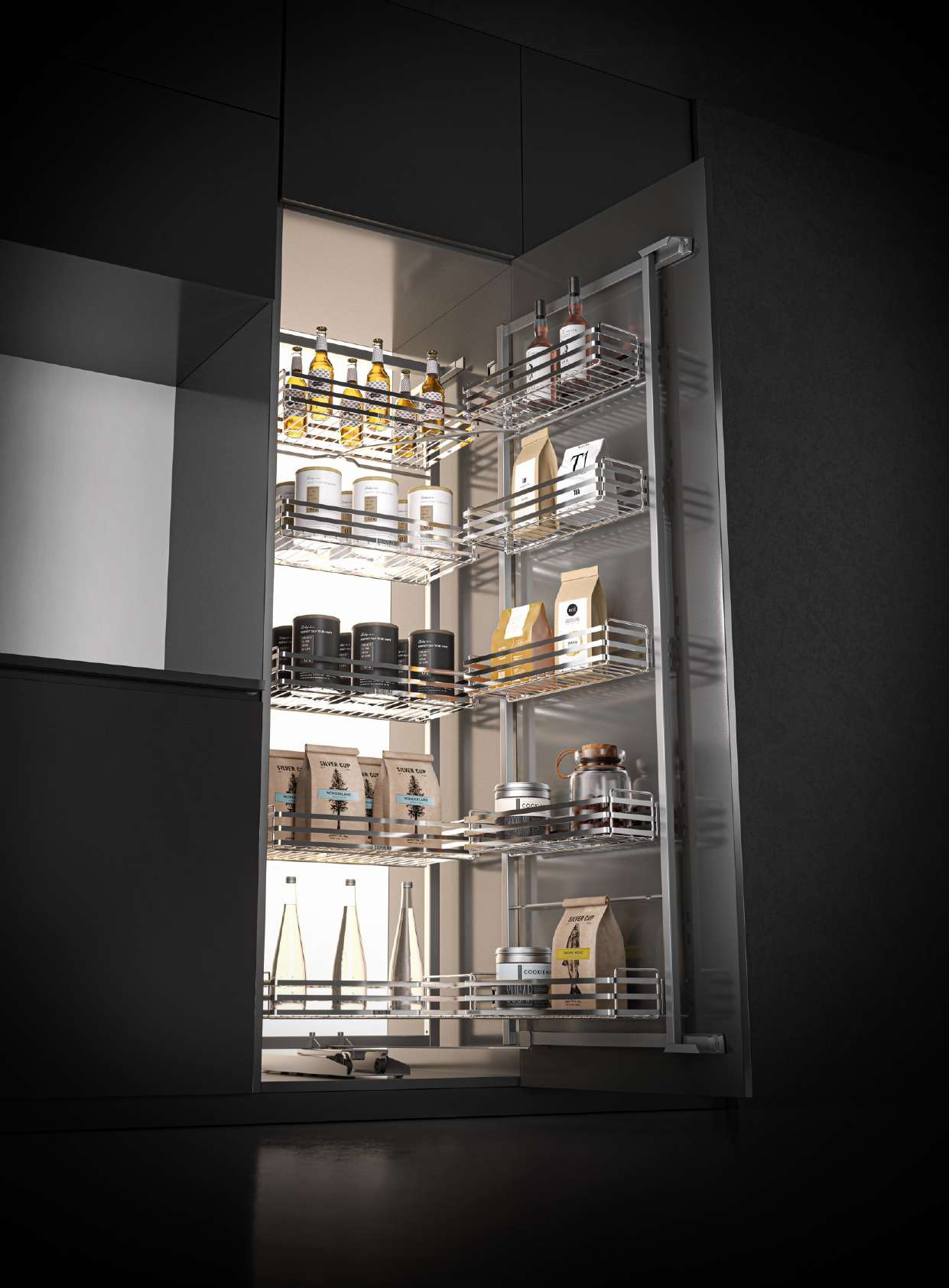 Chức năng: Sử dụng không gian cao và hẹp một cách khéo léo để tạo ra tủ lưu trữ cao, có thể lưu trữ nhiều loại thực phẩm đóng gói, hộp lưu trữ, v.v.