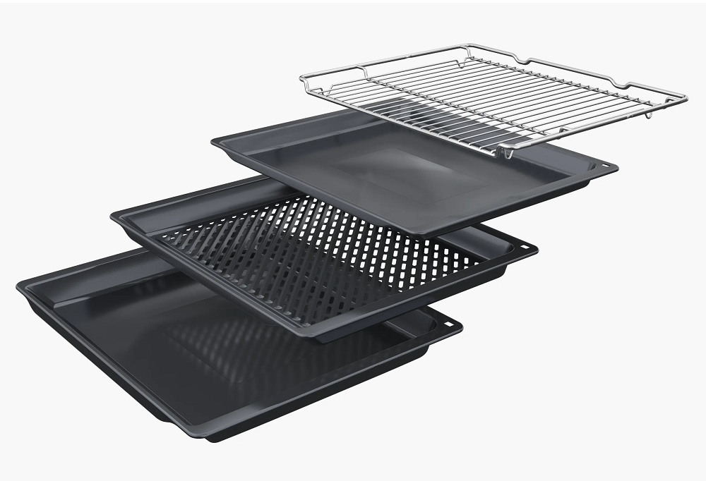 Chiên không dầu & khí nóng 3D: Chức năng Chiên không dầu cho phép các món ăn giòn, ít chất béo, khí nóng 3D phân phối nhiệt trên ba cấp độ - bao gồm khay nướng tráng men, giá đỡ kết hợp lớn và chảo đa năng