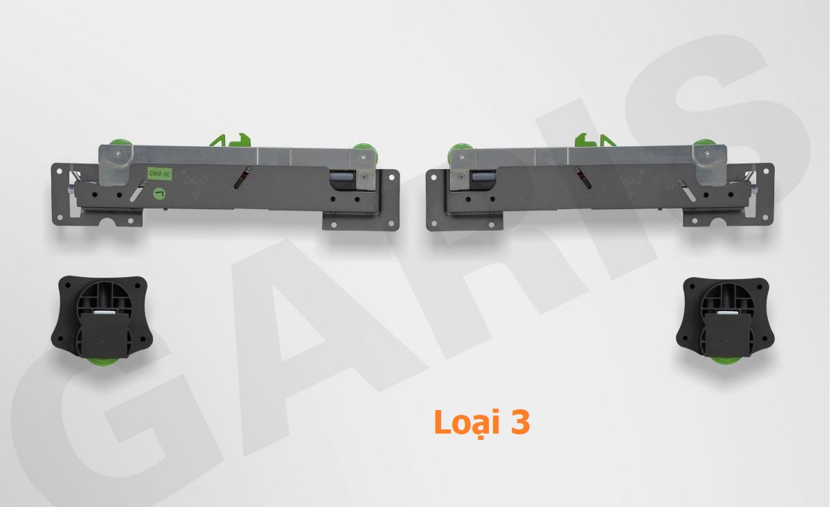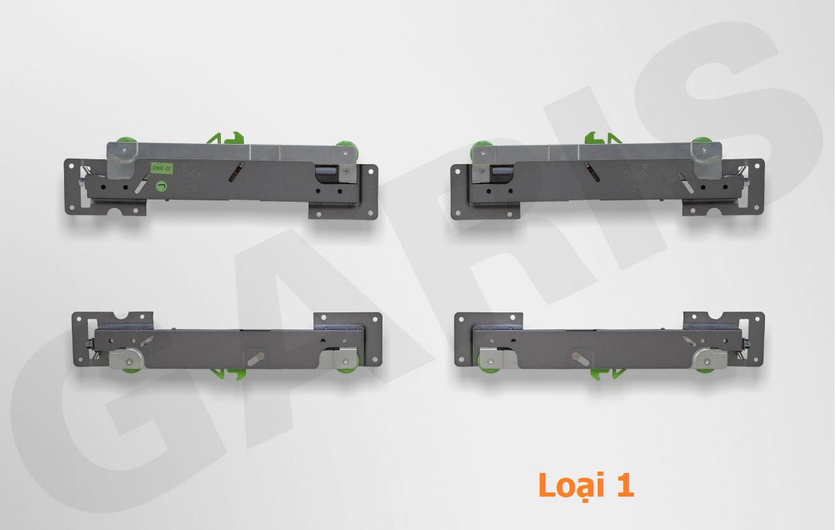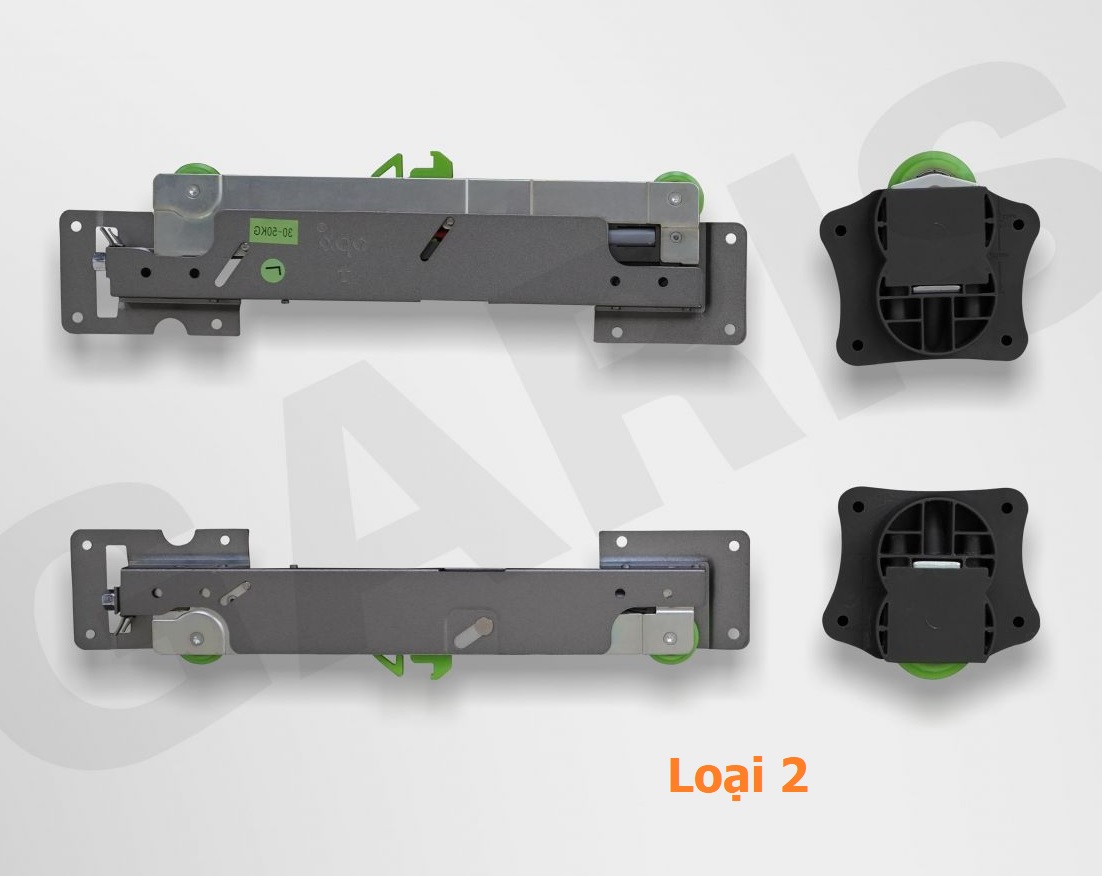 Đặc điểm: Bánh xe thường bằng nhựa và bánh xe giảm chấn bằng thép (có thể điều chỉnh độ cao), có thể dùng đồng thời cả 2 loại bánh xe. Sử dụng 2 ray dẫn hướng bên trên và 2 ray dẫn hướng bên dưới, cây ray dài 3m